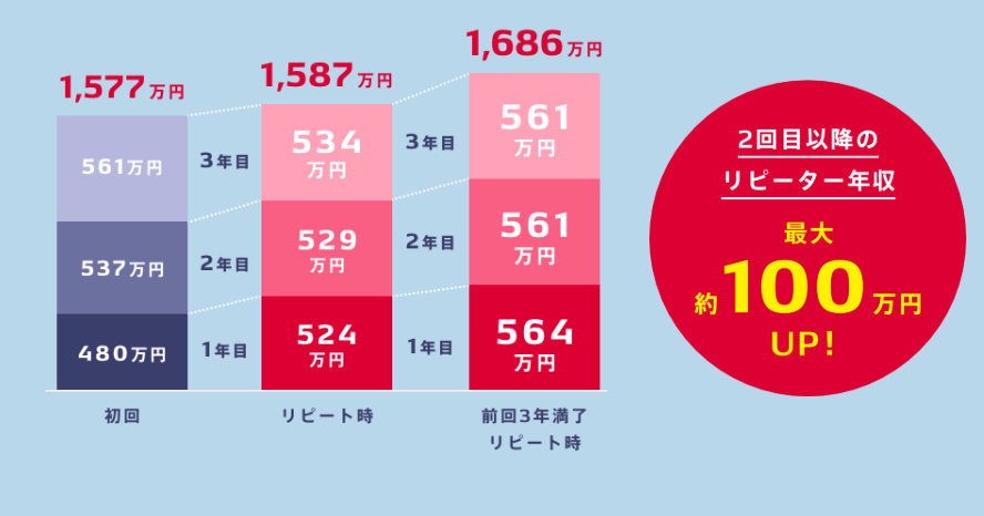 初回で3年勤務した人が3年目に561万円なのに、リピートで戻った人は3年目になっても初回に30万円も差をつけられるのは何だろう、謎。同じ3年目なんだから561万円にしたらいいのに…。